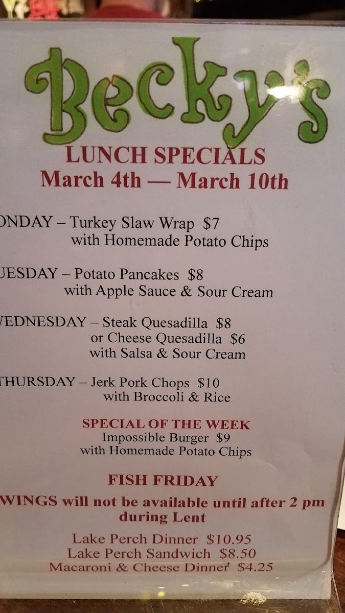 “ I would recommend Becky’s for happy hour and dinner. The bar service was fast and friendly. The burger and fries were pretty good, on par with standard dive bar food. Can’t beat 2.50 wells on happy hour either. Will definitely be back! ”